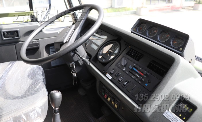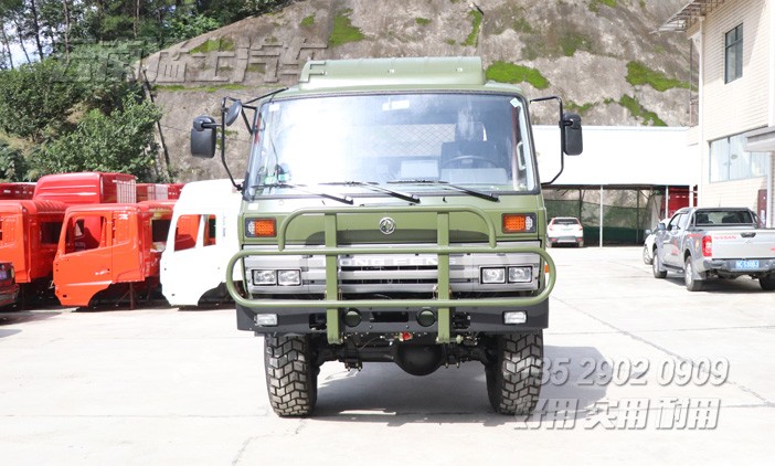 EQ2102NJ底盤是EQ2102GJ的高配版,擁有雙排駕駛室,可乘坐5人。備胎安裝在駕駛室后方,車輛帶有輪胎充放氣系統(tǒng)、雙油箱、頂置空調(diào)、牽引系統(tǒng)、冷啟動系統(tǒng)。