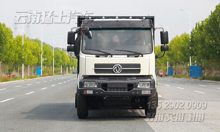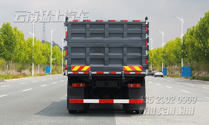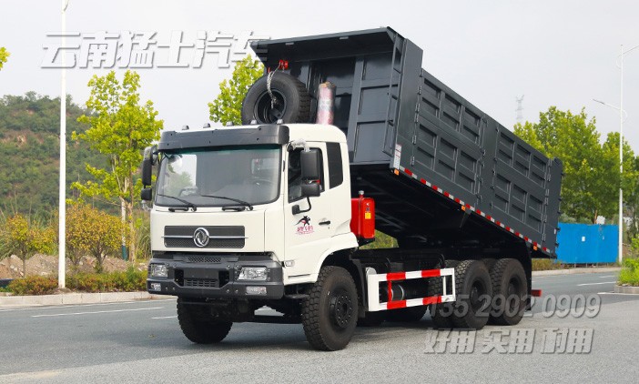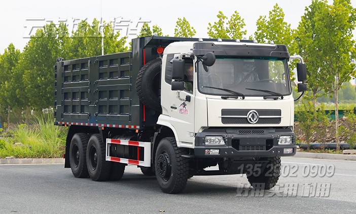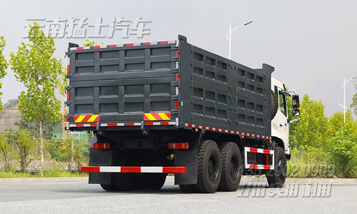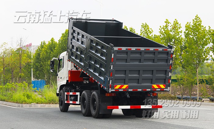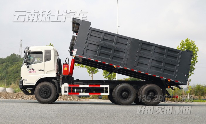 東風(fēng)6*4后八輪重型自卸車采用玉柴340馬力發(fā)動機(jī),貨箱舉升可不掛檔,最大承載20噸貨物。貨箱邊5底6,五開門,后門中門。