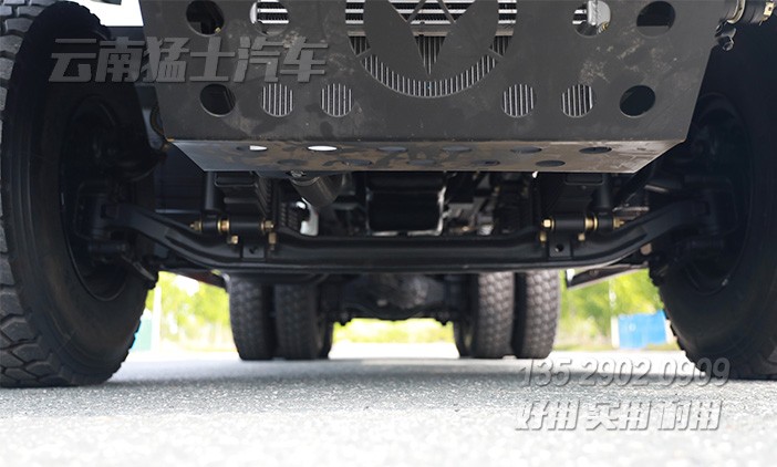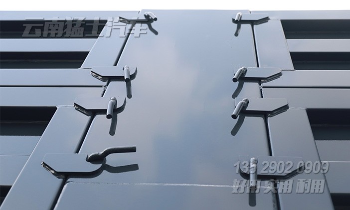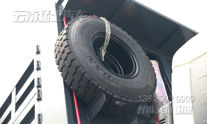 邊板田字格花紋,左右邊板可開啟。備胎安裝在駕駛室與貨箱之間,有專用備胎升降機(jī)構(gòu)。