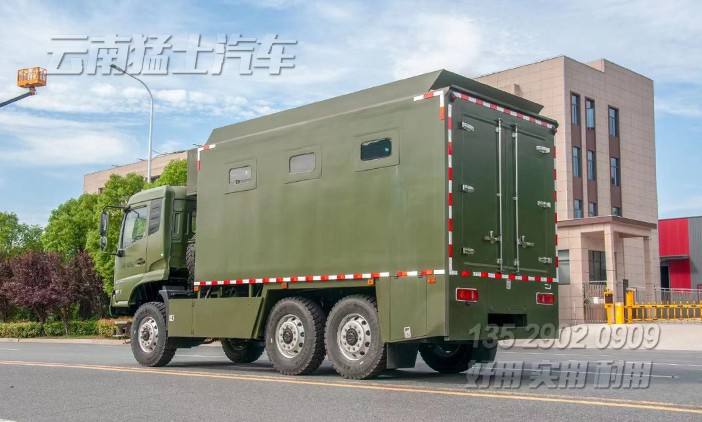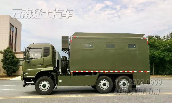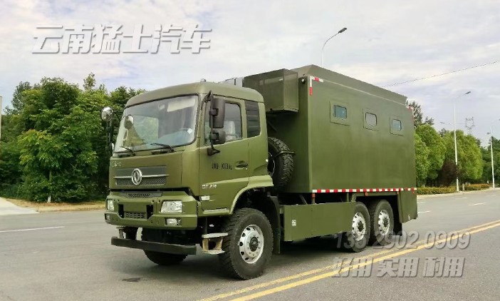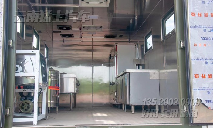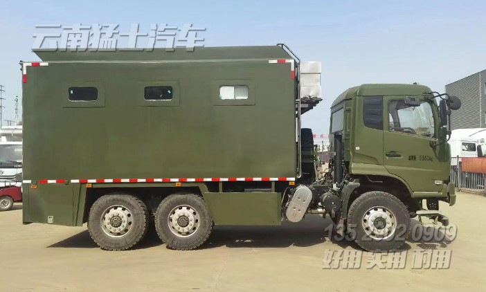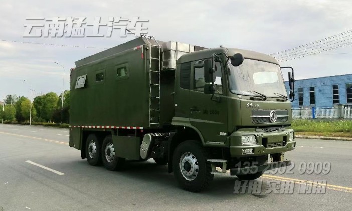東風(fēng)自行式戶外炊事車,該車配備190馬力發(fā)動(dòng)機(jī),六輪驅(qū)動(dòng),可在惡劣路況下形式,主要針對(duì)戶外露營(yíng)、野外訓(xùn)練中就餐使用,最多可容納200人就餐。