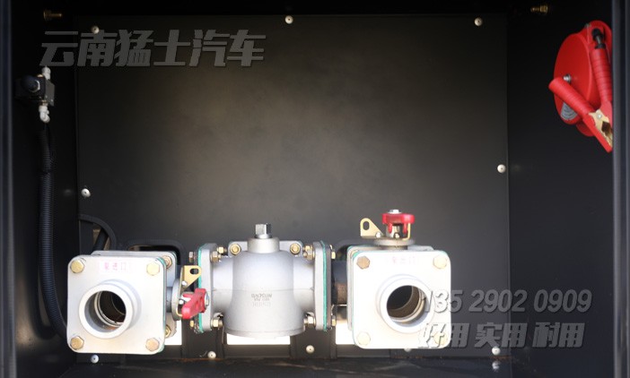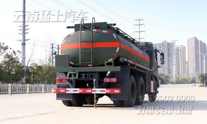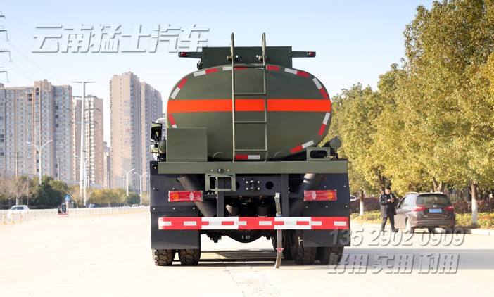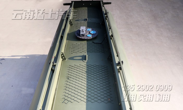 車尾帶有爬梯,可以通往罐體頂部。罐體頂部平臺(tái)兩側(cè)帶有折疊安全扶手,罐體頂部中間帶有歐標(biāo)加油口,罐體內(nèi)安裝2道阻浪板,隨車還配有油罐。