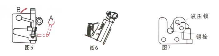 沿(圖5)箭頭方向扳動手柄,使油缸上棘爪脫落卡槽(圖6),按住電動舉升開關(guān),或?qū)u桿A和搖桿B連在一起后插入搖臂中,上下?lián)u動搖桿下落到位,確認(rèn)液壓鎖處于(圖7)鎖止?fàn)顟B(tài)。保持手柄在A位置。