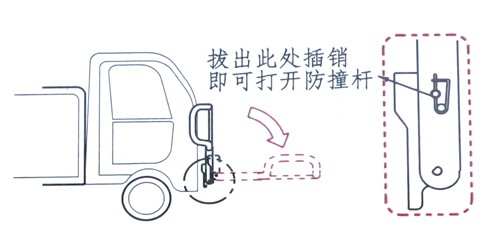 警告:駕駛室翻轉(zhuǎn)前,必須先打開駕駛室前防撞杠,否則會嚴(yán)重?fù)p壞駕駛室