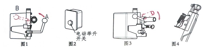 沿(圖1)箭頭方向扳動手柄,按住電動舉升開關(guān)(圖2),或?qū)u桿A和搖桿B(總隨車工具箱中取出)連在一起后插入搖臂中,上下?lián)u動搖桿(圖3),升起駕駛室,確認(rèn)油缸上棘爪卡入卡槽中(圖4)