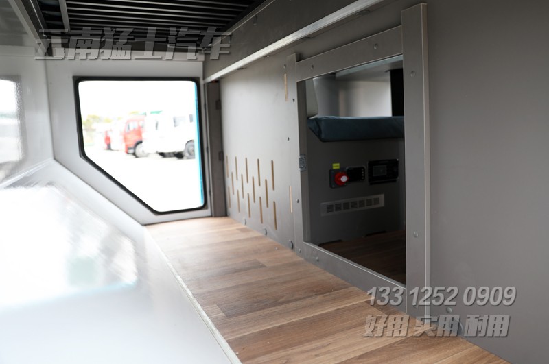 ? ? 后方的房車艙自然是我們這款車的主要部分,我們從駕駛員方向繞一周先看看它的外觀。車體一共安裝了4個亞克力雙層真空推拉窗戶,隔音效果良好。艙體上的艙門依次是排污艙、加水艙、外接電源、貫通式儲物艙、普通儲物艙。排污艙是我們在途中所產(chǎn)生的排泄物儲存的地方,它連接車內(nèi)馬桶,是一個獨立的盒子,不會有異味,可以直接抽出清理,方便衛(wèi)生;底盤上我們安裝了一個120L的清水箱和60L的灰水箱,清水箱是日常用水,灰水箱是洗手洗菜時積攢的廢水,用來沖馬桶使用,加水口里可以直接對清水箱進(jìn)行補充;在有電源的地方我們可以使用外接電源口對車艙進(jìn)行充電,該車安裝有1個24V的鋰電池,專供房車內(nèi)部使用,同時也帶有行車充電功能;貫通式儲物艙貫通整車車艙,左右均可打開,同時與房車內(nèi)部連接,主要用來儲存一些常用的物品;普通儲物艙主要用來儲存一些不常用的雜物。車體的另一側(cè)分別是貫通式儲物艙的側(cè)門、普通儲物艙、折疊上車扶手、隱藏式上車踏步、房車車門、抽拉式灶臺、熱水器散熱口。這邊的普通儲物艙內(nèi)帶有一個液化氣壇,可供抽拉灶臺和熱水器使用;折疊扶手和隱藏式上冊踏步都是方便我們出入房車內(nèi)使用;抽拉灶臺可以讓我們在戶外做簡單的烹飪。車體還安裝有照明燈和伸縮式遮陽棚,遮陽棚完全展開有2.5*3米大。