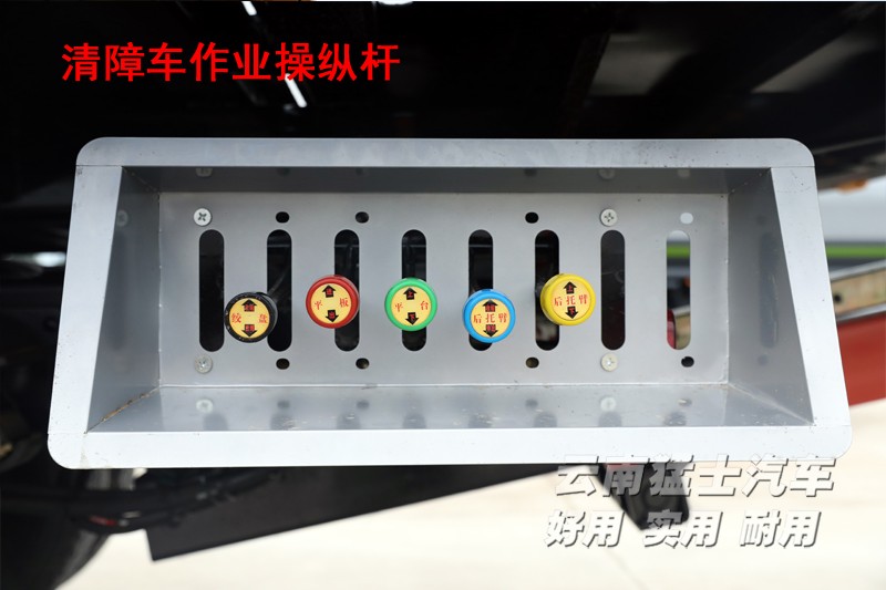 ? ? ? ? ?第一個黑色操縱桿是控制絞盤鋼絲繩的伸縮,故障車輛無法移動時,需要借助絞盤的牽引力將故障車拖拽到清障平臺上。第二個紅色操縱桿是控制清障平臺的伸縮,配合第三個綠色操縱桿使用,可以將平臺接觸地面,從而將車輛移動到平臺上,如果故障車輛無法正常行駛,則需要借助絞盤的牽引來移動。