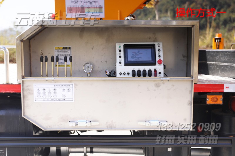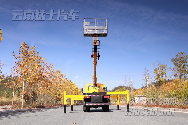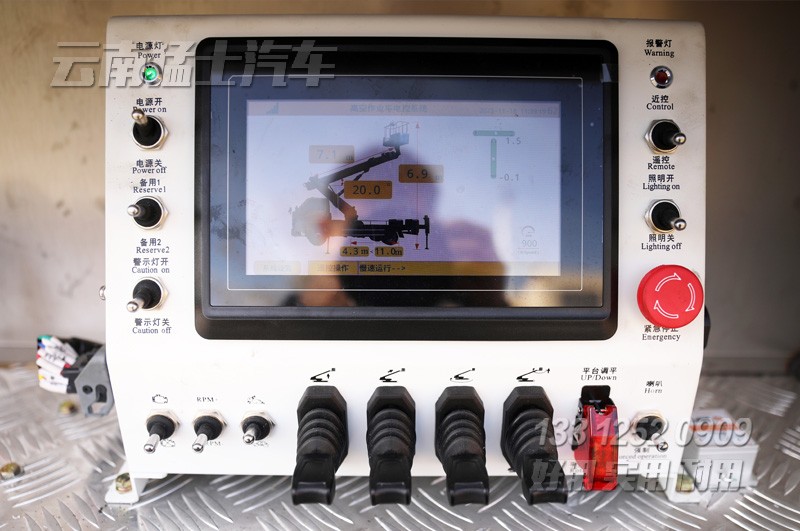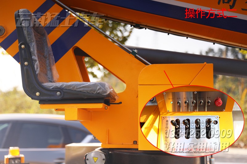由東風(fēng)4*2輕卡底盤改裝而成的22米高空作業(yè)車采用了150馬力發(fā)動機,前橋2噸,后橋4.5噸,整車重6310kg,外廓尺寸6910*2180*3250mm。后方舉升臺可以使用操作艙、操作臺、遙控器三種方式操作,具體操作方法如下: