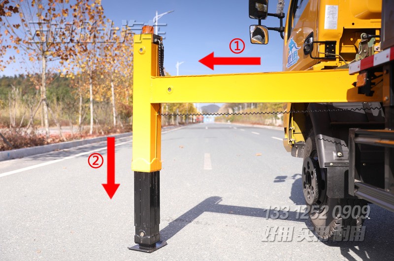 第四步:操作操作面板旁的手柄,將平臺的四個支腿,全部展開,并支撐在地面上,將車輛調(diào)整至水平。