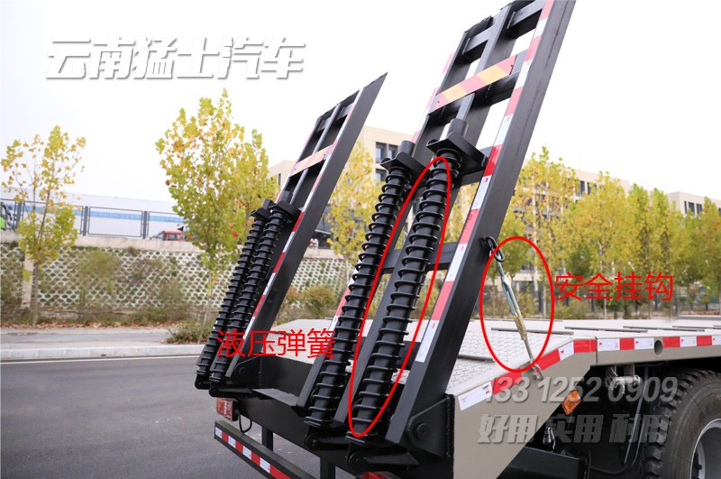 Q:車尾的爬梯也叫做挖機(jī)板,是通過手動翻轉(zhuǎn)的方式,將爬梯放到地面,其他車輛可以通過爬梯開到平板上,在運(yùn)輸車輛時(shí)非常關(guān)鍵。爬梯翻轉(zhuǎn)采用彈簧液壓結(jié)構(gòu),同時(shí)配有安全掛鉤,省力又安全。