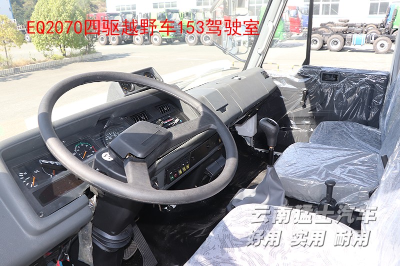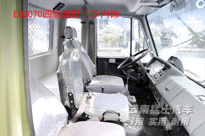 EQ2070駕駛室同樣采用的東風153一排半駕駛室,前方帶有防護欄,內部可容納3人,帶有一處臥鋪。駕駛室采用液壓翻轉結構,方便維修。