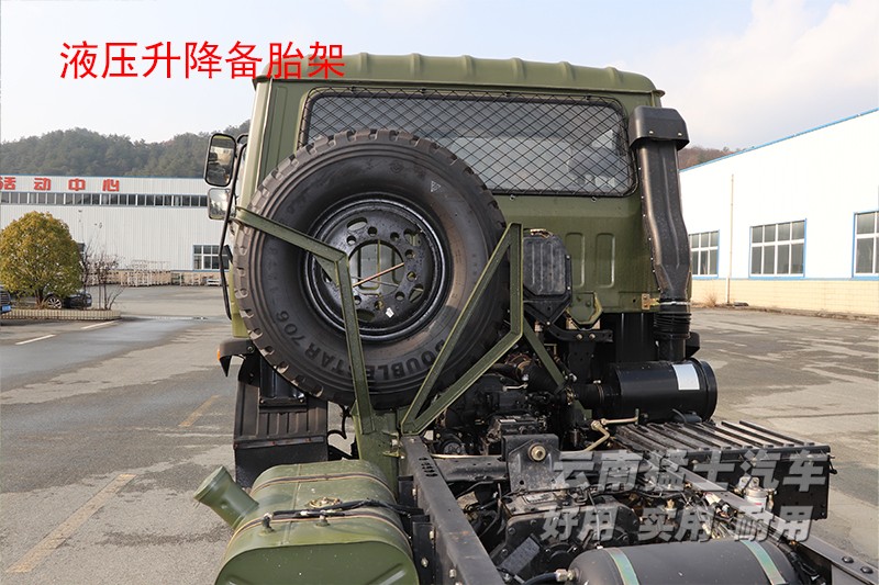 駕駛室后方設有專用的液壓備胎支架,方便在野外發(fā)生故障時進行輪胎更換。預留剎車降溫水箱、絞盤、副油箱的安裝空間。