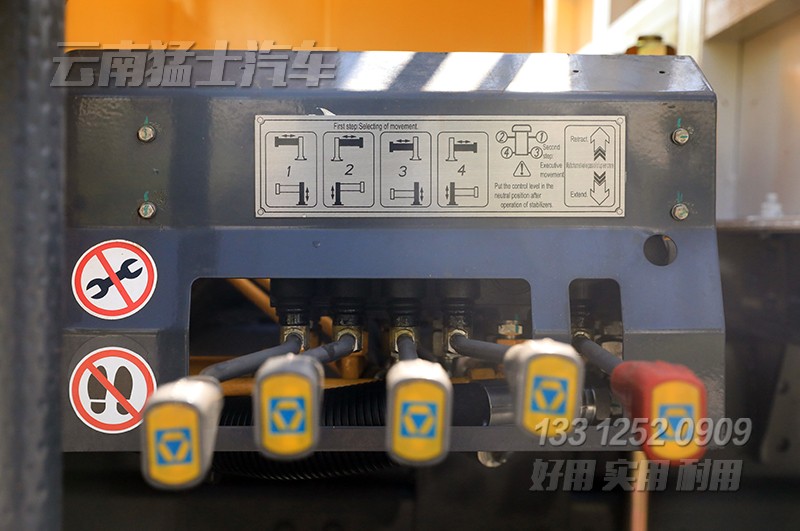 第二步:通過(guò)操縱桿將車(chē)輛的四個(gè)支腿伸出下降,穩(wěn)固支撐在地面,四個(gè)支腿和車(chē)輪保持齊平,讓車(chē)輛處于水平狀態(tài)。
