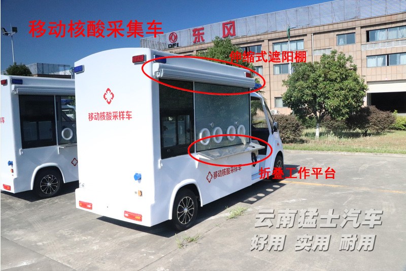 該車是一款電動車,體積小巧,駕駛方便,可以臨時停放在任何平坦路面進行核酸采集,隨停隨走。艙內封閉的空間不會受天氣影響而無法工作,同時可安裝空調,讓核酸采集員更加舒適的工作。艙內長2450mm寬1350mm高1850mm,足夠容納2名工作人員同時對2組居民開展核酸收集,內置消毒燈,有效殺死艙內細菌病毒,同時艙內還有足夠的空間存放各類防疫物資。車上裝有伸縮式遮陽棚,可以為正在采集核酸的居民遮風擋雨??烧郫B的工作臺、對講機等都是為了居民著想而設計的。完全密封的醫(yī)用采樣手套,讓醫(yī)生與居民0接觸進行采樣,避免交叉?zhèn)魅荆WC防疫人員的健康。