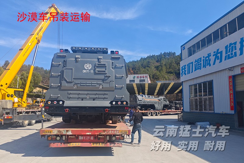 車輛出廠前我們?cè)跓o人路段及工地上進(jìn)行了路測(cè),確保沒有問題后才交付給客戶。由于該車超寬超高,無法在公路上行駛,所以采用半掛車背運(yùn)的方式,將翻滾架和輪胎卸掉,用專用吊具進(jìn)行裝運(yùn)。